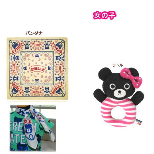 - アイテムはすべてミキハウス☆ループ付ハンドタオル(34×34cm)、ランチスタイ、ラトル、バンダナ(53×53cm)