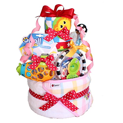 人気ブランド、Sassy(サッシー)のアイテム&オーボールで出来たオムツケーキです。