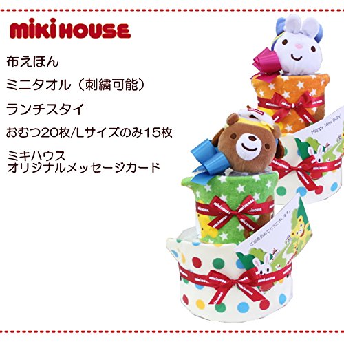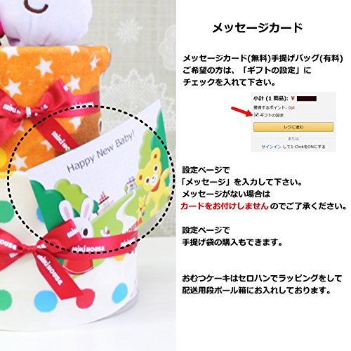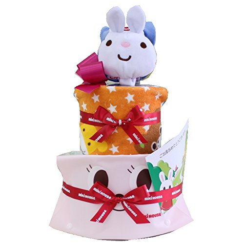 赤ちゃんの安心ブランドミキハウスのアイテムがついた2段おむつケーキです。