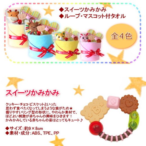 - ミキハウスのマスコットループ付ハンドタオル(34×34cm) スイーツの形の歯固め