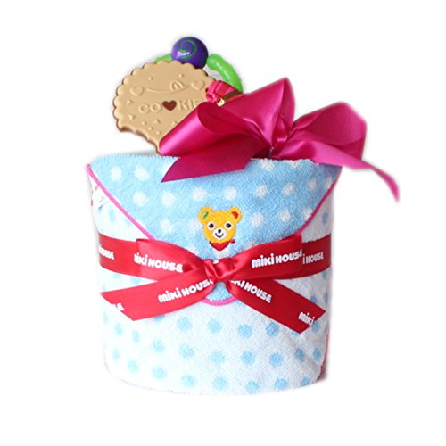 ミキハウス1段おむつケーキ 水色ドットミニタオル (女の子用, パンパースM)