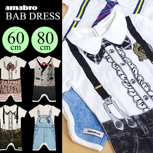 少し気取りたいベビーやキッズのためのブランド、amabroのBABシリーズです。すべてトロンプルイユ(だまし絵)になっているユニークなデザインです。結婚式のお呼ばれなんてシーンにも、一枚着ればきっちり正装もOK!コットン100%で着心地もバツグン♪丸洗いもできて、ママにもうれしいアイテムです。クールガイもキュートガールもオシャレにキマるラインナップ!出産祝い等のギフトにも大変人気のBABシリーズは、ギフトパッケージに入れてお届けします。