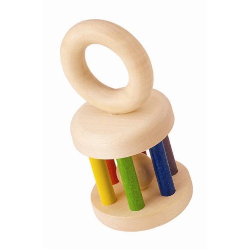 小さな木の玉がきれいな色のケージに閉じ込められていて、赤ちゃんがリングのハンドルを持って動かすたびにカランカランと優しい音が鳴ります。横に置いて転がしても、色が変わっていく様子を見て赤ちゃんは喜ぶでしょう。