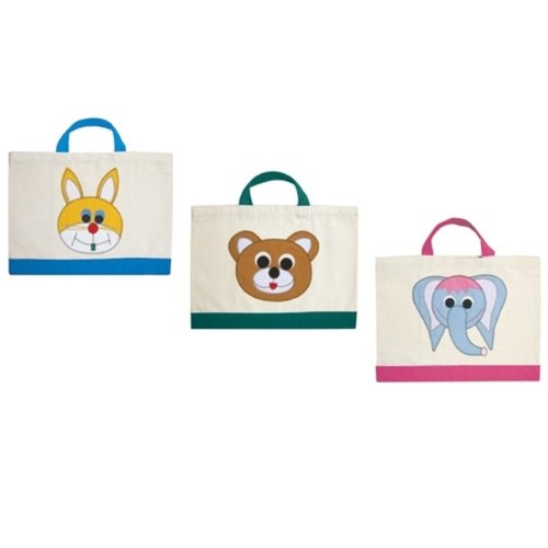 サイズ:横42×縦30cm持ち手:26cm内ポケットサイズ:横18×縦12cmしっかりした帆布でできている丈夫なレッスンバッグ。パイピングでアクセントをつけた内ポケットは携帯電話や定期入れなどが入る大きさで、口にマジックテープがついているので中身が落ちずに安心。B4サイズの本が入るちょうど良いサイズで横長タイプ。小さなお子さんでも引きずりません。また、スケッチブックやピアノのバイエルなど大型の本もちゃんと入る大きさになっています。塾へのお迎えやお出かけのさいちゅうでも、お子さんをひと目で見つけることができるのもこの大きなキャラクターのついたバッグの特徴です。兄弟姉妹で別々のキャラクターがついたものをお求めになってもいいですね。キャラクターは色別にぞう(ピンク色)、うさぎ(みず色)、くま(緑)の3色展開です。