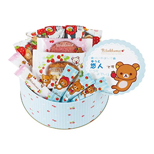 リラックマのデザインの可愛い缶にいろいろなおかきをアソートして名入れカードを入れました。男の子はブルー、女の子はピンクの缶がとても可愛いです。