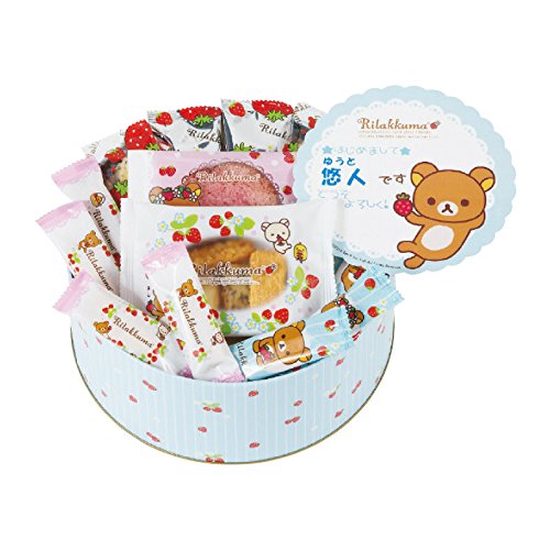 リラックマのデザインの可愛い缶にいろいろなおかきをアソートして名入れカードを入れました。男の子はブルー、女の子はピンクの缶がとても可愛いです。