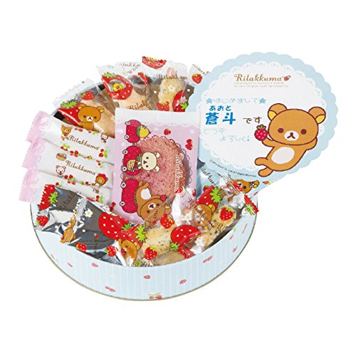 リラックマのデザインの可愛い缶にいろいろなおかきをアソートして名入れカードを入れました。男の子はブルー、女の子はピンクの缶がとても可愛いです。