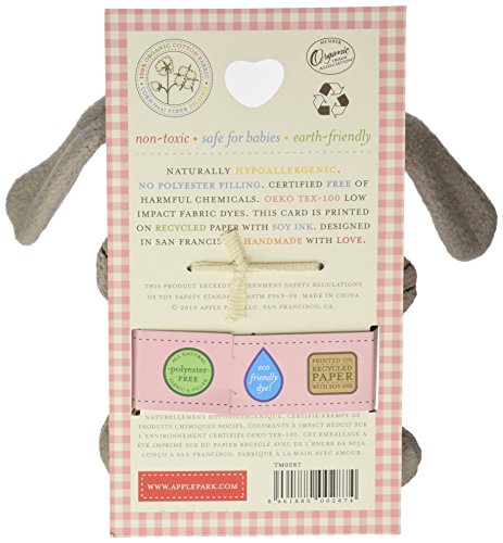Apple Park's Bunny Picnic Pal Soft Ring Rattle is firmly stuffed, and feels soothing on your baby's tender gums;Stitched details and a gentle rattle combine to make this toy a sure-fire favorite;Made with 100% organic cotton and hypoallergenic, natural corn fiber filling, this soft-stuffed toy measures 6'' x 6'';Winner of Dr. Toy's Best Green Product Award, Best Vacation Product Award, and Best Bay Area Toy Company Award;Safe for children, better for the environment, and always beautifully green, that's the Apple Park Promise