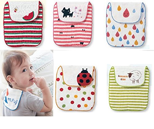 - 背中や首元に汗をたくさんかく、ベビーやキッズには何枚も必要となるアイテムです。かわいい柄が5枚セットになっているので、その日のコーディネートや気分に合わせて選ぶのも楽しい。また、リバーシブルになっているので両面楽しめます。
