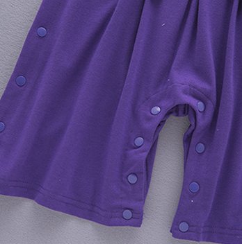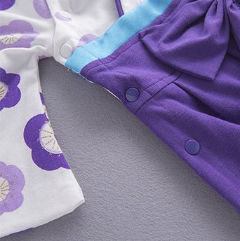 - 右肩部分から脇を通って右足裾の部分と、内股部分に掛けて、スナップボタンにて脱着可能となっており、寝かせたままのお着替えは勿論、おむつの交換も簡単に出来ます。