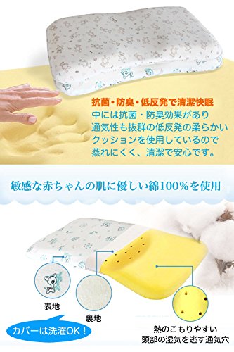 ゆったりサイズ(幅46cm)で、赤ちゃんの頭が落ちにくく、左右に寝返りしやすいので安定感が抜群!赤ちゃんの良質な睡眠を考えたベビー枕です。肩の曲線に沿った形が寝返りをサポートしてくれます。 ねんね期の赤ちゃんは寝ている時間が長く、向き癖がついてしまうことがあります。まだ頭の柔らかい赤ちゃんは頭の形が歪んでしまったり、絶壁になりやすいものです。 枕を使用して反対側にも向かせやすくしたり、赤ちゃんが寝る場所や添い寝の位置を変えて向き癖を改善し、歪みが生じないようにすることが大切です。 このベビー枕は人体工学に基づき、赤ちゃんの頭・首・肩の自然な曲線に合うように設計されていて、仰向け寝や横向き寝にしても、中央のくぼみが頭を優しく包んで均一に頭圧を分散してくれるので、寝返りがしやすくなり、頭の形が良くなります。さらにくぼみの部分には通気穴があるので熱のこもりやすい頭部の湿気を逃します。 表地は、肌に優しい綿100%を使用しており、洗濯も可能。中には抗菌・防臭効果があり、通気性も抜群の低反発の柔らかいクッションを使用しているので蒸れにくく、清潔で安心です。 こじか柄とこぐま柄の2種類からお選び頂けます。 baby-mineベイビーマイン商標出願済み