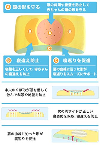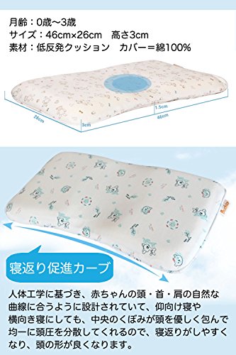 ゆったりサイズ(幅46cm)で、赤ちゃんの頭が落ちにくく、左右に寝返りしやすいので安定感が抜群!赤ちゃんの良質な睡眠を考えたベビー枕です。肩の曲線に沿った形が寝返りをサポートしてくれます。 ねんね期の赤ちゃんは寝ている時間が長く、向き癖がついてしまうことがあります。まだ頭の柔らかい赤ちゃんは頭の形が歪んでしまったり、絶壁になりやすいものです。 枕を使用して反対側にも向かせやすくしたり、赤ちゃんが寝る場所や添い寝の位置を変えて向き癖を改善し、歪みが生じないようにすることが大切です。 このベビー枕は人体工学に基づき、赤ちゃんの頭・首・肩の自然な曲線に合うように設計されていて、仰向け寝や横向き寝にしても、中央のくぼみが頭を優しく包んで均一に頭圧を分散してくれるので、寝返りがしやすくなり、頭の形が良くなります。さらにくぼみの部分には通気穴があるので熱のこもりやすい頭部の湿気を逃します。 表地は、肌に優しい綿100%を使用しており、洗濯も可能。中には抗菌・防臭効果があり、通気性も抜群の低反発の柔らかいクッションを使用しているので蒸れにくく、清潔で安心です。
