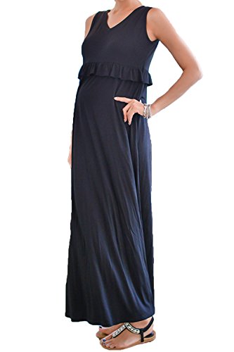 - かわいい胸元のフリルがポイントのノースリーブ マタニティ Vネック ロングワンピースです。 そのフリルの下には、ジッパー式の授乳口もついています。