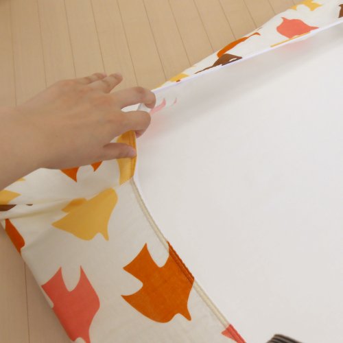 敷カバーの裏側にはゴムがついており、敷ふとんにかぶせるだけでラクラク! 金具が一切なく、赤ちゃんにも安心です。