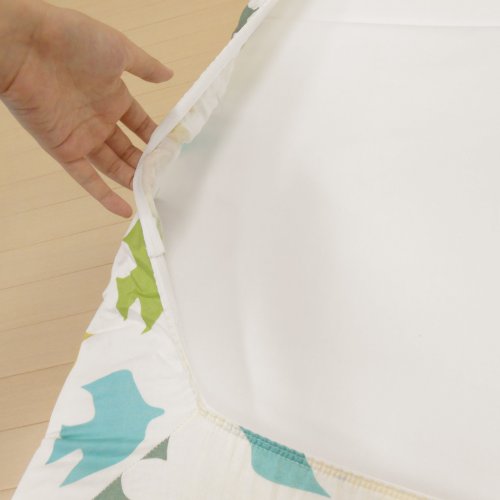 敷カバーの裏側にはゴムがついており、敷ふとんにかぶせるだけでラクラク! 金具が一切なく、赤ちゃんにも安心です。