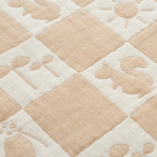 市松模様の中に、リス、小鳥、太陽等、かわいいモチーフが織られています。