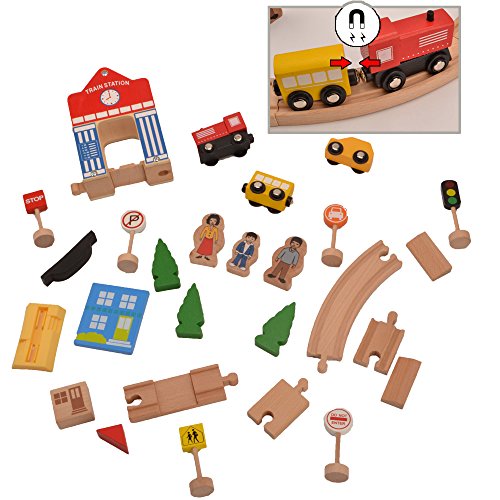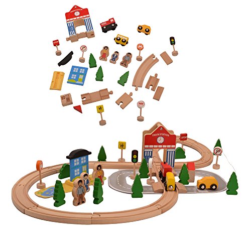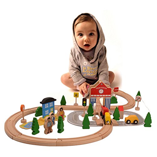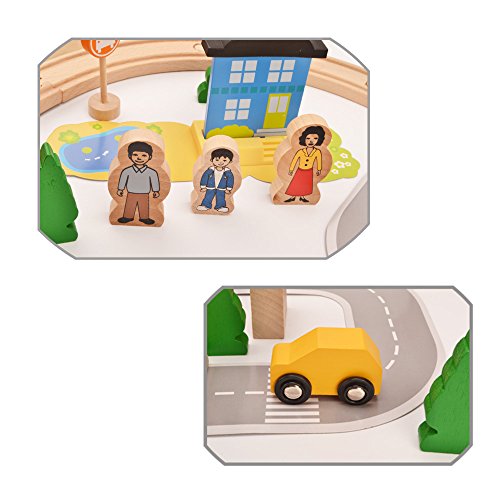 - 2.内容:木*6 人物*3 列車駅 列車 車 交通標識*6 列車軌道の積み木(直線積み木、カーブ積み木)*19 道路 芝生 建物*2