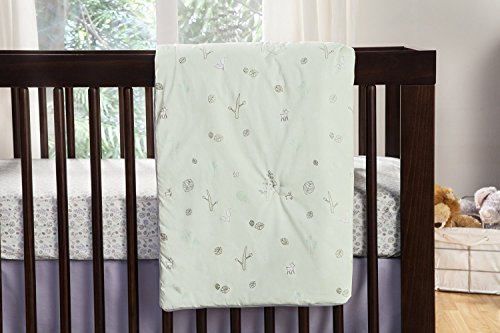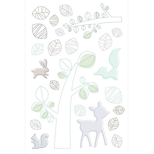 The TRANQUIL WOODS 5-Piece Set combines modern nursery essentials for baby's comfort. A fitted crib sheet featuring the miniature flora and fauna of a woodland landscape is paired with a tailored, fog grey crib skirt. The imaginative play blanket is perfectly padded for active play, and the contour changing pad cover is topped with a luxurious French terry cloth that is soft to baby's touch and easy-to-clean. To complete your scenic nursery, playfully arrange easy to apply decals across nursery walls.