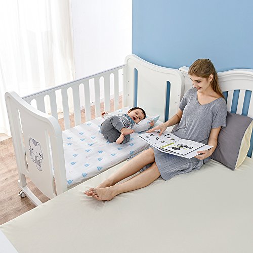片側の柵を取り付けないままで大人のベットと並べて、子供と一緒に寝て面倒を見るのも便利!