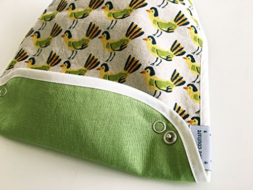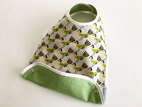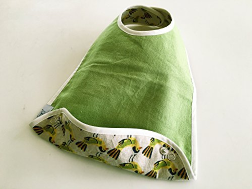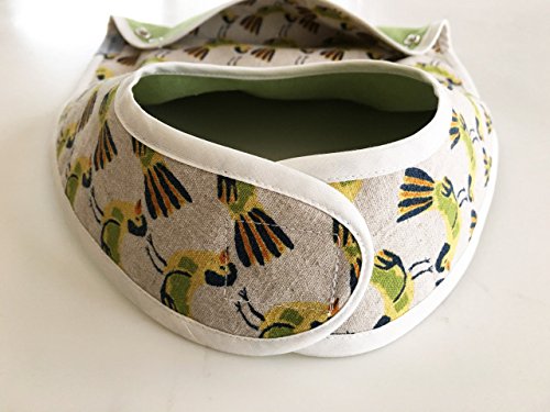 温かみのある小鳥のデザインのお食事スタイです。裏側は、麻100%のグリーン。コントラストが大人っぽくて素敵です。リバーシブルタイプのスタイです。柔らかい首元で、ビニール素材のお食事スタイを嫌がるお子様にも安心してお使いいただけます。内側に、水を通しにくいシートを挟んで作っていますので、コットンのお食事スタイでありながら、浸透しにくいのは使い心地抜群です!また、軽くてクルンと丸めて収納でき、かさばらないので、持ち歩く時にとっても便利♪こんな可愛いお食事スタイなら、きっと食事が楽しくなりますよ。お食い初めのお