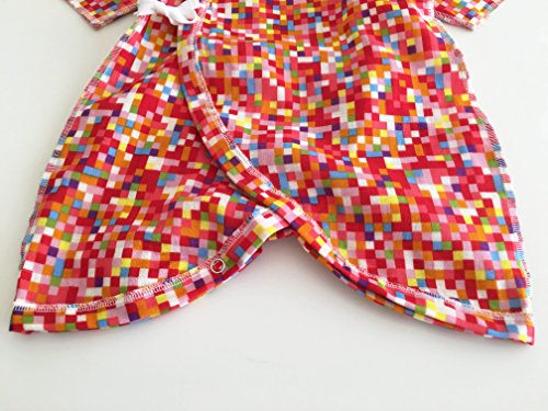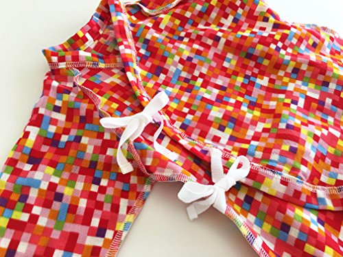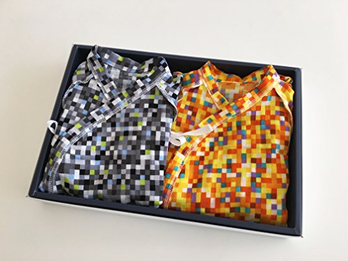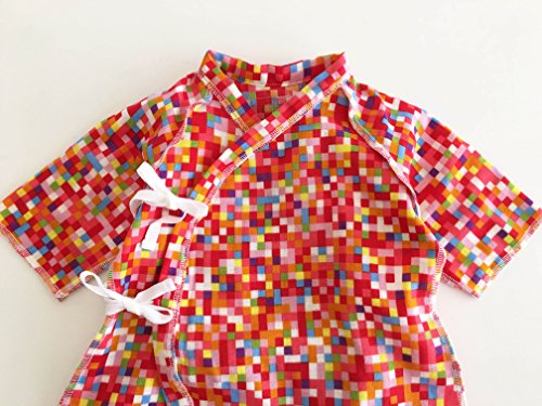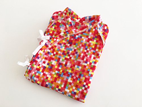 日本製の上質なコットンダブルガーゼを使用しています。赤ちゃんの肌着として。風呂上がり着として。優しいガーゼで包んであげて下さいね。ビビットなカラフルモザイク柄です。ナチュラルな色のモノが多いロンパース。友達からの注目度アップ間違いなし。60cmから70cmまでです。新生児の柔らかいお肌に刺激を与えないよう縫い目を外にして作っています。また、足元でスナップボタンで留めるようになっています。縫い目が直接当たらないように外に出してお作りしています。