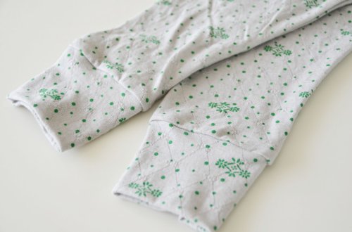 男の子にも女の子にも お勧めできる スパッツが仲間入り♪グレーベースにグリーンのランダムドット柄。 お花も模様も少し入っています。アーガイル織りで形もスッキリしています。スパッツは、お洋服の合わせやすさが選ぶポイントです!また上も深めにしてあるので、おむつのモタモタ感がなくスッキリします。