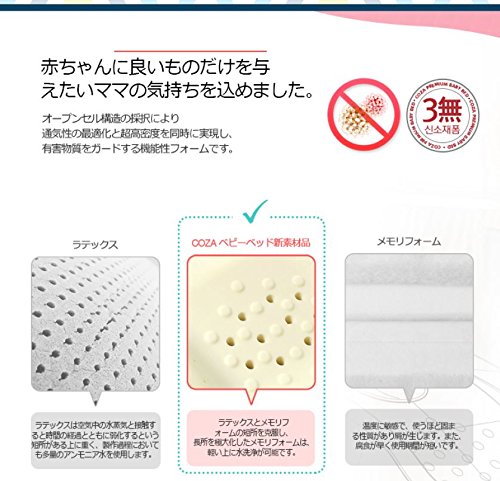 使用推奨年齢: 新生児~6ヵ月 メモリーフォーム : 大量の汗をかく赤ちゃんたちに向け、計21つの穴を作って空気が循環するよう製作された新素材コジホーム サイズ : 760 x 420 x 135mm 製品重量: 1.5-1.6kg 素材: 枕表地オーガニック100%、側面のポリエステルの100%、枕の中カバーのポリエステルの100% 原産地:韓国