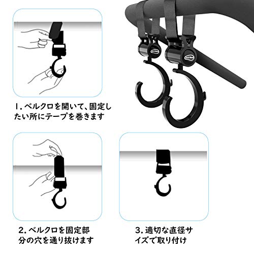 Zenoplige ベビーカー フック マルチフック 荷物フック マジックテープ 取り付け簡単 360度回転 自転車 スーツケース 荷物かけ グッズ 多用途 2個セット