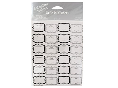 Add captions to photos with this fun 48-piece anniversary wishes write-in photo caption stickers set. Perfect for anniversaries, the set features four styles of decorative photo caption stickers. Includes two 7.5; X 5.5; Sheets of stickers. Acid and lignin free. Comes packaged in a poly bag with a header card.
