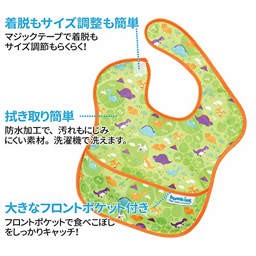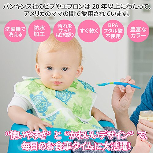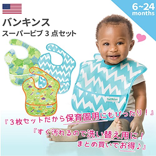 アメリカ売上げNo.1ビブ! バンキンスの大ベストセラースーパービブの、洗い替え用にぴったりな3点セット。 ソースやケチャップなどの油汚れもするんと落ち(ボーケン規格 BQE A 039 4.5級の実力)、 洗濯機で丸洗いもできる、機能性バツグンのエプロンです。 ・幅広な袖部分がお食事中の汚れからお洋服をしっかりガード。 ・留め具は、首の後ろにマジックテープ。 ・バンキンスオリジナルのウォータープルーフ素材で汚れも簡単にふき取れる。 ・防水加工済みで浸みこみにくく、匂い移りしにくい。 ・ポケット付で食べこぼしをしっかりキャッチ。 ・洗濯機で洗えてすぐ乾きます。 毎日のお食事に使う物だから、お手入れカンタンなのが嬉しい。 表面加工がされているので洗濯後も色あせにくい。 Bumkinsのビブやスモックは全てPVC、BPA、フタル酸、ビニール、鉛不使用の安心素材で出来ています。 Bumkins商品は、玩具や子供製品の有害物質含有量に関して厳しい基準を設けた、 米国消費者製品安全性改善法(CPSIA:Consumer Product Safety Improvement Act)の基準をクリアし、 カリフォルニアの州法プロポジション65の定めたガイドラインを遵守しています。 プロポジション65とは、正式名称:Proposition65 Safe Drinking Water and Toxic Enforcement Act of 1986 (1986年 安全飲料水および有害物質施行法)で、 作業者や消費者が有害物質に暴露する可能性がある場合、 事前に警告(告知)することを義務付けている米国カリフォルニアの州法です。