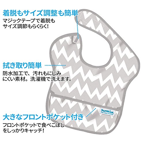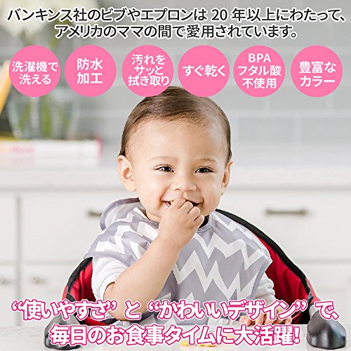 アメリカ売上げNo.1ビブ! バンキンスの大ベストセラースーパービブの、洗い替え用にぴったりな3点セット。 ソースやケチャップなどの油汚れもするんと落ち(ボーケン規格 BQE A 039 4.5級の実力)、 洗濯機で丸洗いもできる、機能性バツグンのエプロンです。 ・幅広な袖部分がお食事中の汚れからお洋服をしっかりガード。 ・留め具は、首の後ろにマジックテープ。 ・バンキンスオリジナルのウォータープルーフ素材で汚れも簡単にふき取れる。 ・防水加工済みで浸みこみにくく、匂い移りしにくい。 ・ポケット付で食べこぼしをしっかりキャッチ。 ・洗濯機で洗えてすぐ乾きます。 毎日のお食事に使う物だから、お手入れカンタンなのが嬉しい。 表面加工がされているので洗濯後も色あせにくい。 Bumkinsのビブやスモックは全てPVC、BPA、フタル酸、ビニール、鉛不使用の安心素材で出来ています。 Bumkins商品は、玩具や子供製品の有害物質含有量に関して厳しい基準を設けた、 米国消費者製品安全性改善法(CPSIA:Consumer Product Safety Improvement Act)の基準をクリアし、 カリフォルニアの州法プロポジション65の定めたガイドラインを遵守しています。 プロポジション65とは、正式名称:Proposition65 Safe Drinking Water and Toxic Enforcement Act of 1986 (1986年 安全飲料水および有害物質施行法)で、 作業者や消費者が有害物質に暴露する可能性がある場合、 事前に警告(告知)することを義務付けている米国カリフォルニアの州法です。