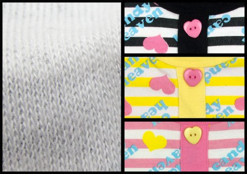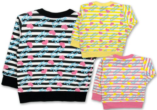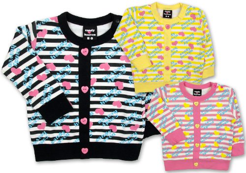 キャンディヘブンのカーディガン風Tシャツ です 保湿性・伸縮性に優れた綿スムス素材 使用 左肩のスナップで着脱ラクラク 全身ボーダー柄にキャンディヘブンのロゴやハートのプリントがたくさん 飾りのハートのボタンがとってもCUTE☆ お色はブラック、イエロー、ピンクの3色展開です サイズ: 80/90/95 カラー: ブラック/イエロー/ピンク 素材: 本体・綿100% リブ・綿95% ポリウレタン5% 原産国: 中国