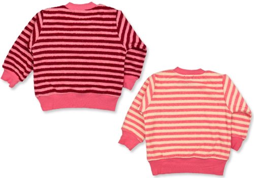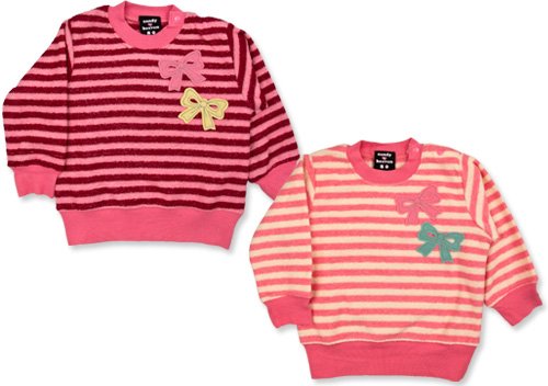 商品説明: キャンディヘブンのリボンアップリケがCUTEなトレーナーです。 表面はループ状の糸で立体感があり、お肌に触れる面はブークレー起毛 左肩のスナップで着脱もラクラク CUTEなお色のボーダー柄 お胸には2つのリボンアップリケ付き。 シルバーのステッチ入りでとっても可愛い お色はレッド×ピンク、ホワイト×ピンクの2色展開です。 サイズ: 80cm/90cm/95cm カラー: レッド×ピンク/ホワイト×ピンク 素材: 本体 ポリエステル100% リブ部分 綿95% ポリウレタン5% 原産国: 中国