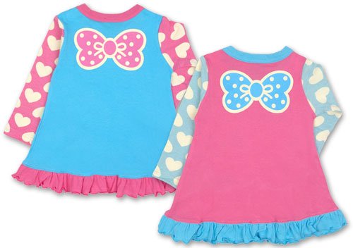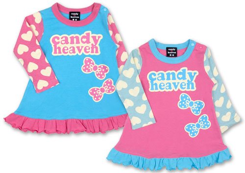 今大注目のブランド、キャンディヘブンより、フリルがついたAラインワンピースです 保湿性・伸縮性に優れた綿スムス素材使用 左肩についたスナップボタンで着脱もラクラク☆ お胸にはキャンディヘブンのロゴと二つのリボンプリント入り お袖にはたくさんのハート柄がとってもCUTE 背中には大きなリボンプリント入り☆ AラインのTシャツでシルエットもかわいいね お色は本体サックスと本体ピンクの2色展開です サイズ: 80/90/95 カラー: 本体サックス/本体ピンク 素材: 本体 綿100% リブ部分 綿95% ポリウレタン5% 原産国: 中国