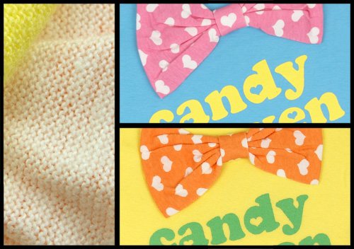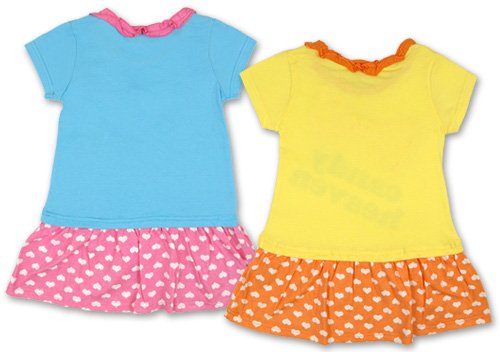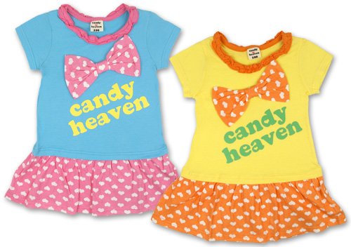 キャンディヘブンのBIGリボンがついた切り替えTシャツワンピです 汗を吸収しやすく、ニット生地では定番の天竺綿使用 胸元にはハート柄のBIGリボンがついていてワンポイント 首回りはフリルつきでスカート部分にはハートプリントが入ってとってもCUTE☆ お色はサックスとクリームの2色展開です サイズ: 100/110/120 着丈(後ろ中心で採寸) 100号 約49cm 110号 約54cm 120号 約59cm 総丈(身丈になります。首寄りの肩縫い目から裾まで) 100号 約53cm 110号 約58cm 120号 約63cm カラー: サックス/クリーム 素材: 本体 綿100% リブ 綿95% ポリウレタン5% 原産国: 中国
