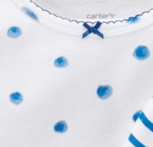 - 白地に青の水玉柄、水玉は少し滲んだようなデザインです。半袖シャツとショートパンツのセット。