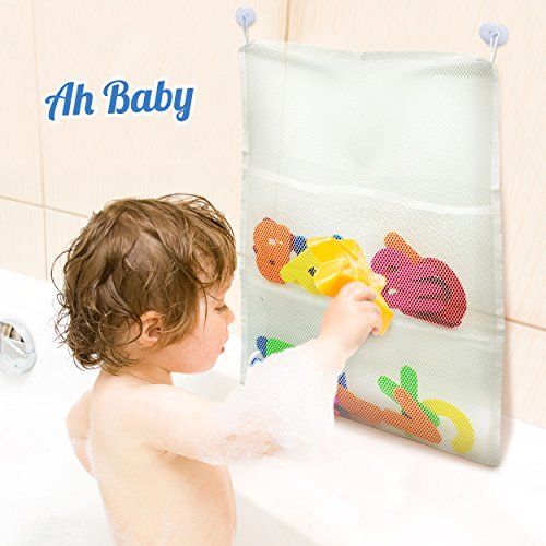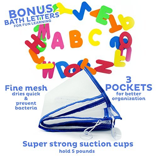 The extra large holder with double reinforced seams and heavy duty suction cups hold over 5 pounds of wet items, so you can keep the water in the tub and not all over the room. Takes less than a minute to mount and it's easy to fill up when playtime is over so your child can help with cleanup. Save your other cabinet space and keep your room tidy and neat. Strong, durable mesh won't bust under pressure and has 3 pockets ideal for small and large toys.