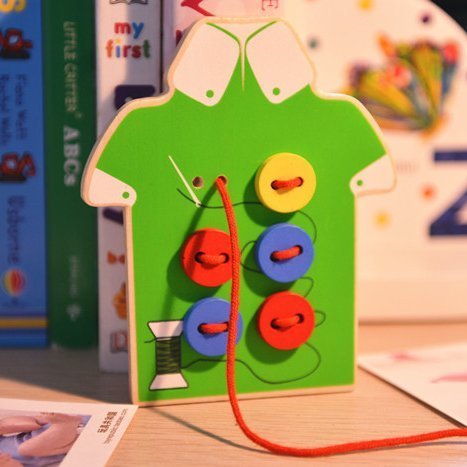 • Material: wooden, • Package: paper card, • Helps kids learn to sew on a button, • Sturdy wooden construction, • Basic skills are fun to develop when using our colorful lacing activities