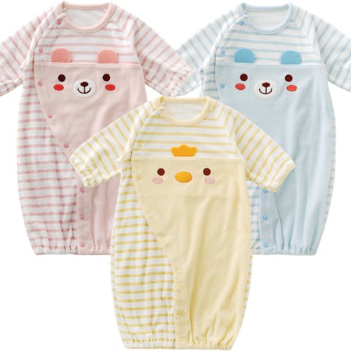 デイリー着に大活躍しそう!通年素材のパイル地を使用した新生児ツーウェイオール。胸元がどうぶつさんのお顔になっているとってもキュートな新生児ツーウェイオールです ねんねの時はドレスとして、ぱたぱた足を動かし始めたら、足元のホックをとめ替えて、カバーオールにして着せてあげてください。【サイズ】 素材・・パイル綿80%ポリエステル20%