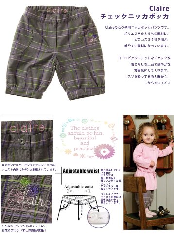 Claireの女の子用ニッカボッカパンツです。ポリエステル65%の素材に、ビスコス35%を加え、着やすい素材になっています。ヨーロピアントラッドなチェックが着こなしを上品で華やかな雰囲気にしてくれます。スソが絞ってあると暖かく、しかもカワイイ インポートベビー服