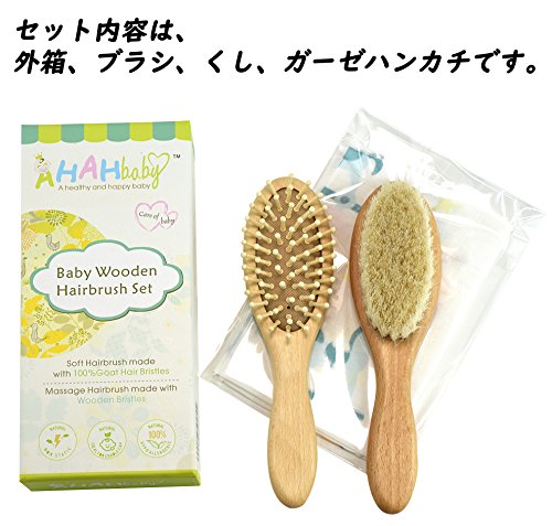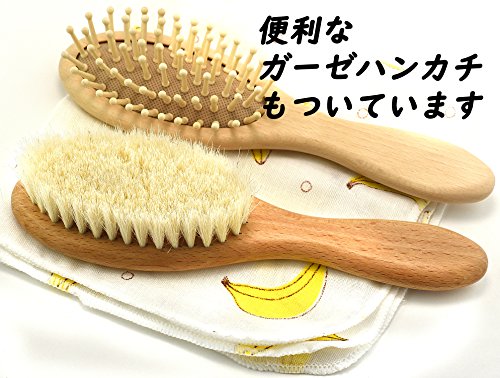 ベビー用 木製 ヘアブラシ 100%天然山羊毛で髪に艶 ブナの木の櫛 2本セット 抗菌加工 ガーゼハンカチ付き