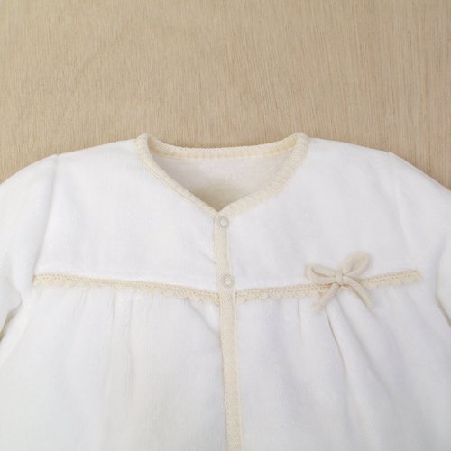 スーピマ綿のタオル地はとにかくふんわりやさしいのですが、こちらはさらに表面はシャーリングしてベルベットのような肌触り、裏はパイル織で吸水性抜群なので、お風呂上り、プール上がりのローブとして、またおやすみまえにガウンとして羽織るのにもふんわり軽く最適です。 胸の切り替えでギャザー寄せしオーガニックコットンレースを縫い付けてリボンも付け、お子様のかわいさ引き立つデザインにしました。 ぐるりとオーガニックニット編みのテープでパイピングしてあるのでやさしい肌さわり。袖口を折り返して着れば歯磨きなどのときもじゃまになりません。