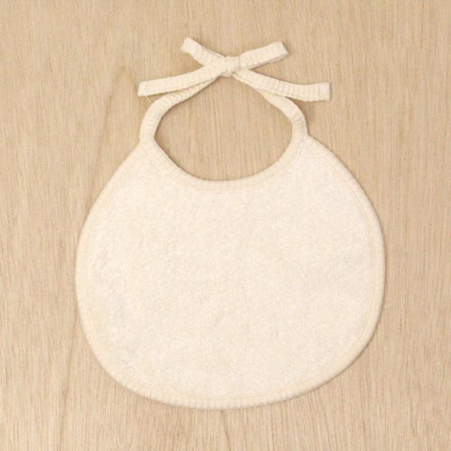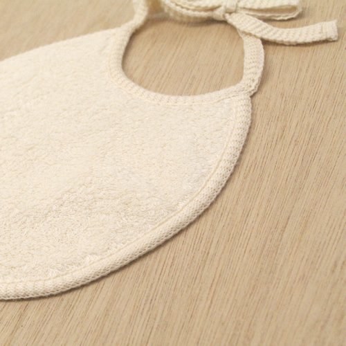 ・肌触り抜群のパイル地で出来たスタイは、かたちも色もシンプルですが、独特のフワフワ感が特徴です。結び紐もオーガニック綿をやわらかく編んだものなので、お首廻りにやさしく沿います。