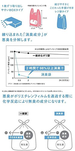 - 人気の消臭袋からBOXタイプが登場。1枚ずつ取り出しやすくなりました。結びやすさにこだわった手提げ付きレジ袋タイプ。中身が見えない色付きです。練り込まれた「消臭成分」が悪臭を分解します。悪臭がポリエチレンフィルムを通過する際に化学反応により無臭の成分になります。