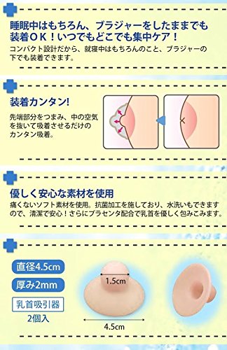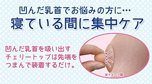 商品紹介 人気のチェリートップがプラセンタを配合してバージョンアップ。キュ~っとバストトップを吸引することで、気になる凹みを正常な位置に戻す 衣服を着ている時も目立たないので、いつでもどこでも簡単ケア。寝ている間でも集中ケアできます 水洗いできるので、いつでも清潔 痛みのないソフト素材を使用しています 仕様:水洗い可 抗菌素材 プラセンタ配合 セット内容:2個入 【使用方法】 1.本品の吸着効果を高めるために、市販のワセリンのクリームやローションを塗布してください。 2.本品を乳頭部に当てます。 3.先端部をつまみ、中の空気を抜いて吸着させます。 使用上の注意 ・使用中皮膚に異常を感じた時は使用を中止してください。 ・外傷等がある場合は使用しないでください。 ・使用後は水洗いし、よく乾かしてから保管してください。 ・小児の手の届かないところへ保管してください。 ※最初は短時間のご使用でお試しください。 ※再使用時は水洗いし、よく乾かしてからご使用ください。