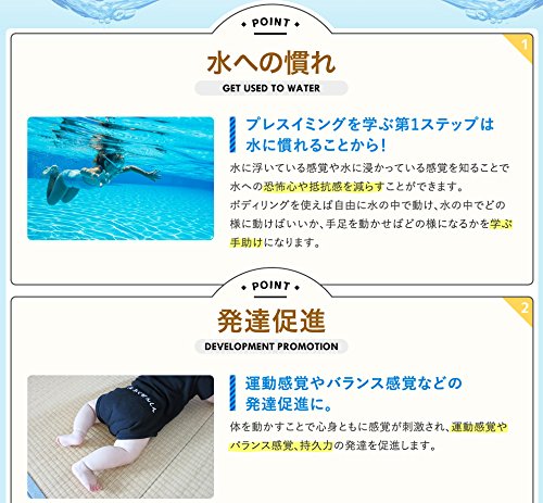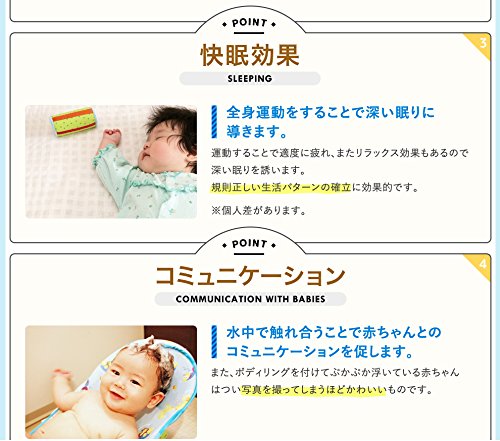 - 快眠効果 親子コミュニケーションのツールに ➡ 全身運動をすることで適度に疲れ、リラックス効果も期待できるので、深い眠りを誘います。規則正しい生活パターンの確立に効果的です。(※個人差があります。) 水中で触れ合ることで赤ちゃんとのコミュニケーションを促します。ボディリングを付けている姿はつい写真を撮ってしまうほどかわいいものです。