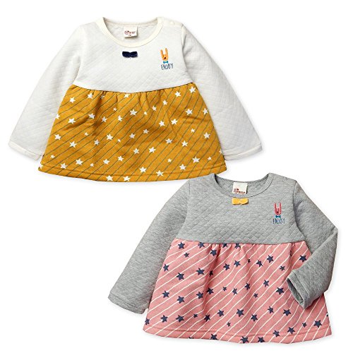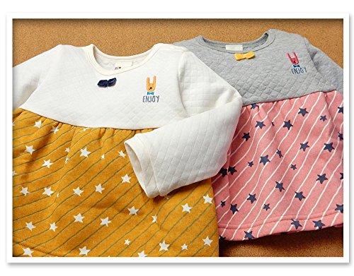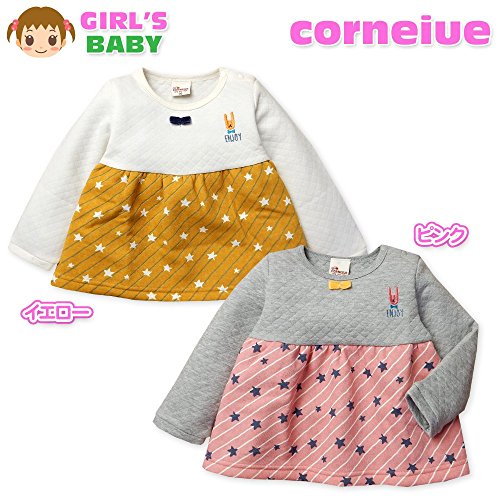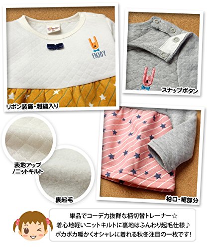 (イエロー/80cm)子供服 女の子 トレーナー 長袖 ニットキルト 裏起毛 ストライプ 星柄切替 リボン 刺繍 女児 ベビー