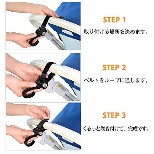 【全国通常配送無料】<新しくなったデザイン>様々なシーンに合うようなカラフルなロゴをデザインしました。これまでの武骨な黒のデザインに華やかさを添えています。【品質に自信があるからこそ,メーカー保証期間1年】 <様々な用途に>ベビーカーのみならず車のヘッドレスト、スーツケース、自転車のハンドル部分、パイプ家具、パイプヘッド、キッチン回り、カートなどマルチにお使い頂けます。 <360度回転+180度首振り>フック部分が360度回転するので、装着後にフックの向きが逆という原因で、再度装着し直す必要はありません。また、首の部分が180度可動するので自由に角度を調整できます。 <マジックテープで取付簡単> ハンドル部分や取付部分にマジック(ベルクロ)テープで簡単に装着!2個セットで約20kgまでの荷物が掛けられます。 <フック部分の厚みと幅> しっかりとした厚みと幅があるフックだから、マザーズバックの持ち手にもフィットします。 <安価品との違い>市場には安価なフックもでていますが、当ブランドのフックはしっかりとした構造をしておりなおかつ軽いです。また、丁寧に検品しているので不具合も少ないです。