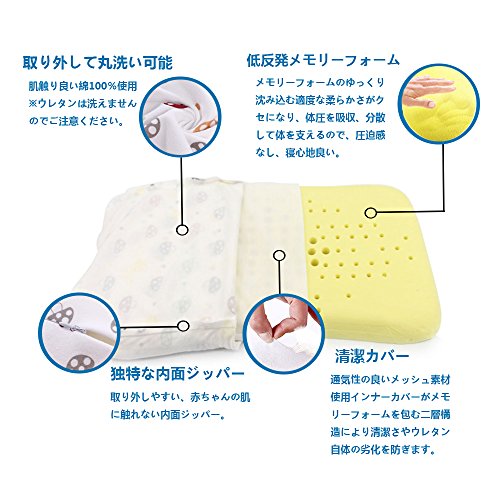 - 2.表側地は、肌に優しい100%綿生地。裏生地は、通気性に優れて熱がこもりにくいメッシュ素材を採用。綿カバーは、柔らかく心地よく汗を吸い取り、洗濯も可能です。寝ている時間が長く、体温が高い赤ちゃんは、頭の後ろに汗をかくことが多いですが。この枕は通気性が良く、汗も良く吸い、汗をサッと吸収してしまうため、赤ちゃんは気持ちよく眠ることができます。