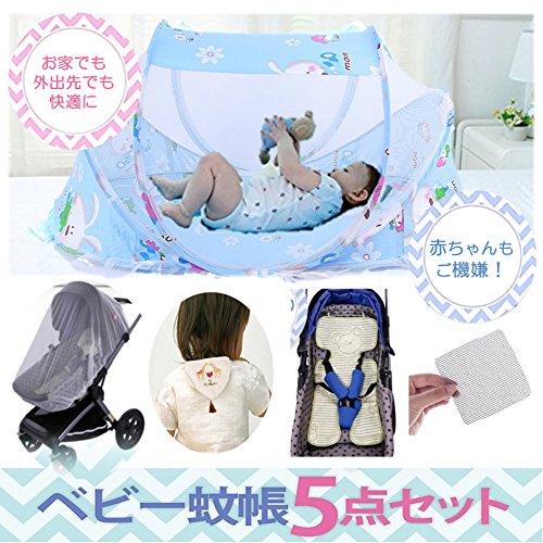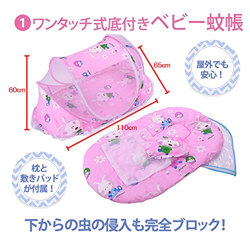 - 【蚊帳のポイント】 ■ワンタッチ式 組み立て不要!3秒ラクラク設置 ■底付き 外でも安心!下からの虫の侵入も完全ブロック ■ベビーベッドに納まるサイズ 製品サイズ110cm×65cm (ベビーベッド一般サイズ120cm×70cm)☆出し入れ簡単です。 ■クッションマット&枕付き 蚊帳に合わせたマットと枕も付属!買い揃える 必要がないお得な3点セットです。 ※ 上記3点セット(蚊帳・クッションマ ット・枕)が収まる収納袋付き!手軽に持ち運びOK、安心して赤ちゃんと一緒におでかけできます。